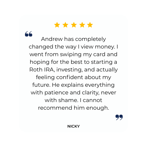 I’m Andrew — a licensed therapist and a financial coach. I help individuals and couples manage money with less stress and more clarity. My approach blends therapeutic tools like empathy, reflection, and zero judgment with practical financial strategies, so you can feel calm and confident about your next steps.